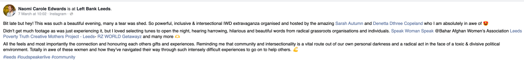 The International Women’s Day event at Left Bank Leeds. What can I say! I came along with a friend not knowing what to expect. Just brilliant! What a fantastic evening and true celebration of women. An inspirational and fantastic lineup from different organisations and backgrounds in the most beautiful venue. Sarah and Denetta were brilliant and brought warmth, humour and knowledge to the event. I have been raving about it to all my family and friends.
