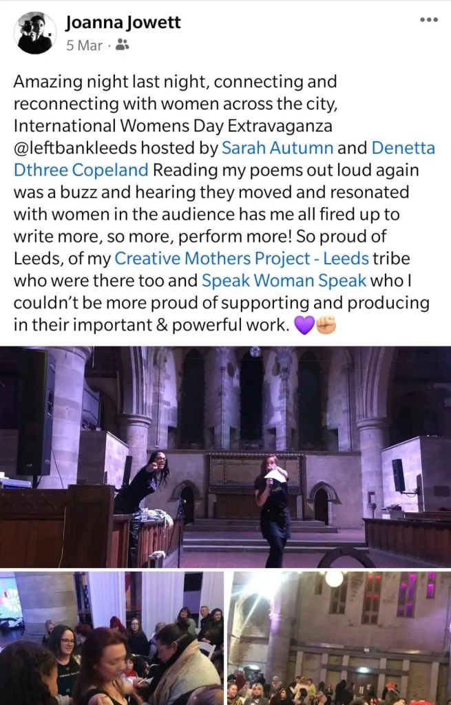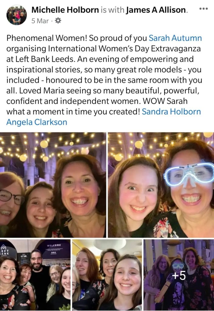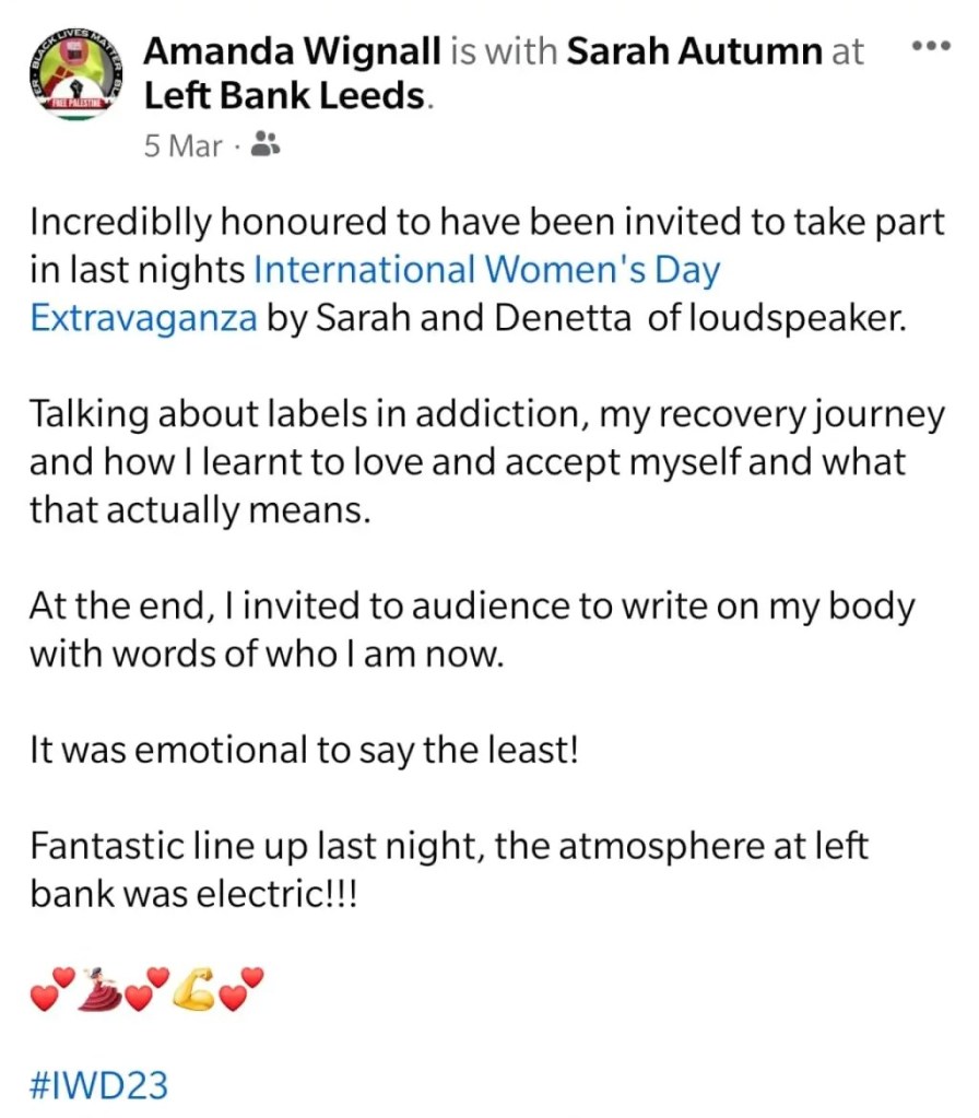 The International Women’s Day event 2023 held at Left Bank Leeds hosted by Denetta Copeland (D3) and Sarah Autumn was brilliant! Theatre, comedy and song gave fabulous entertainment for a massive audience. Voices from women of survival and activism brought such emotional responses from all present. Amazing presentation and hosting.